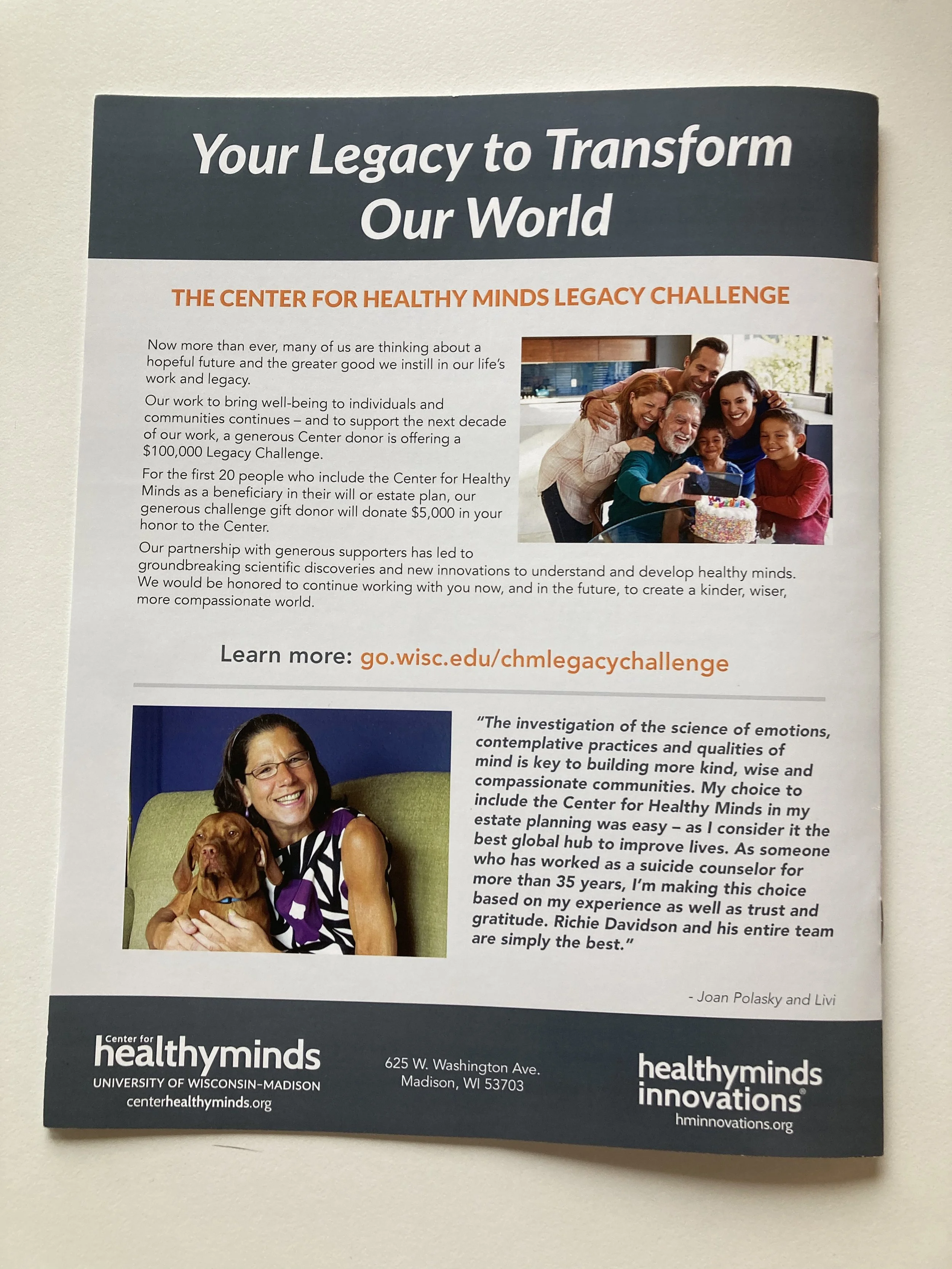 Each year, the Center for Healthy Minds publishes and mails an annual report that shows progress over the previous year and basic financial statements. The 8 page report needed to be printed and mailed. There was also a need for a digital and interactive version to be distributed via the Center’s email list.